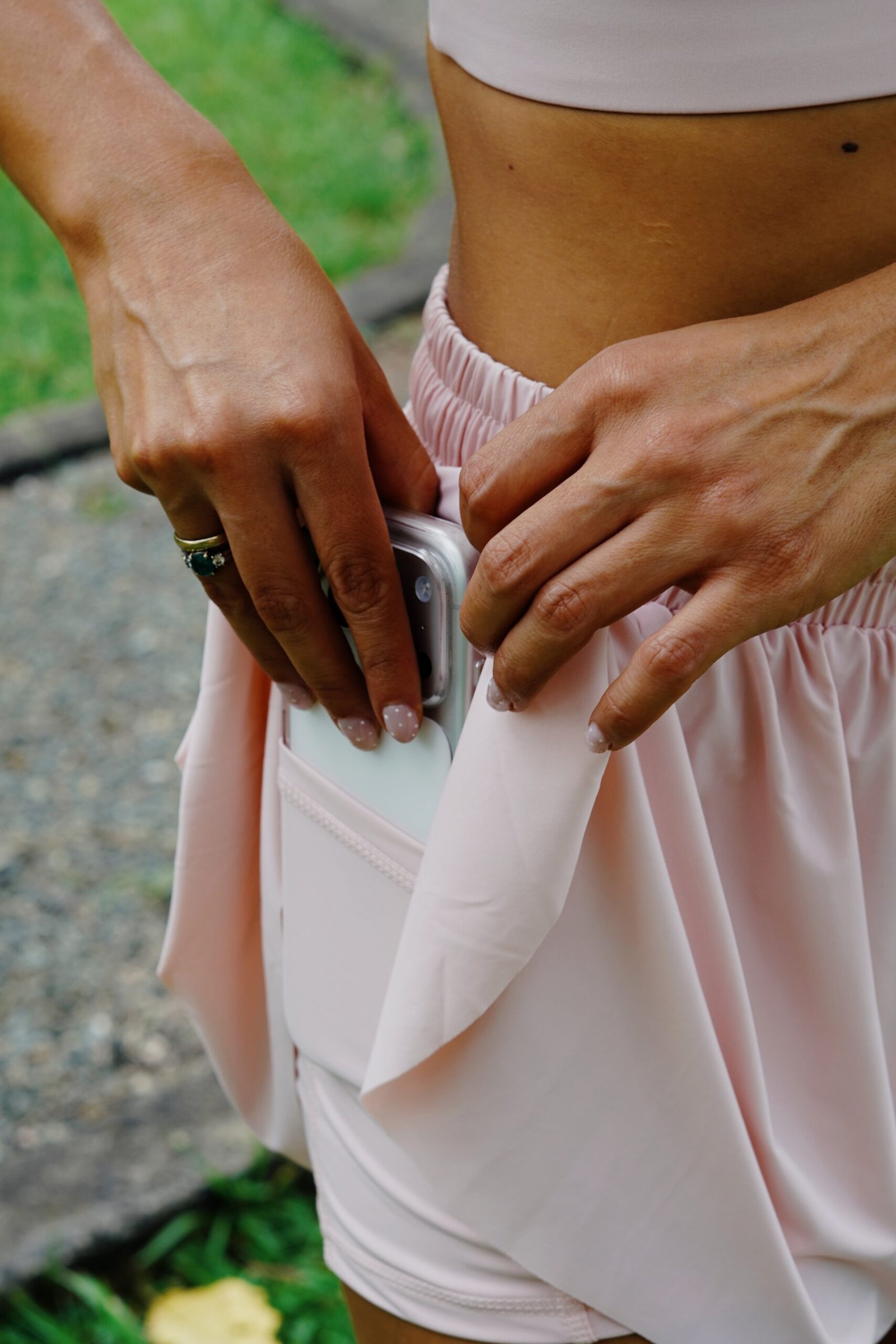 Pantaloneta tipo falda-short, con cordón para ajuste en cintura, libra short debajo y bolsillo a un costado, tela extra suave.